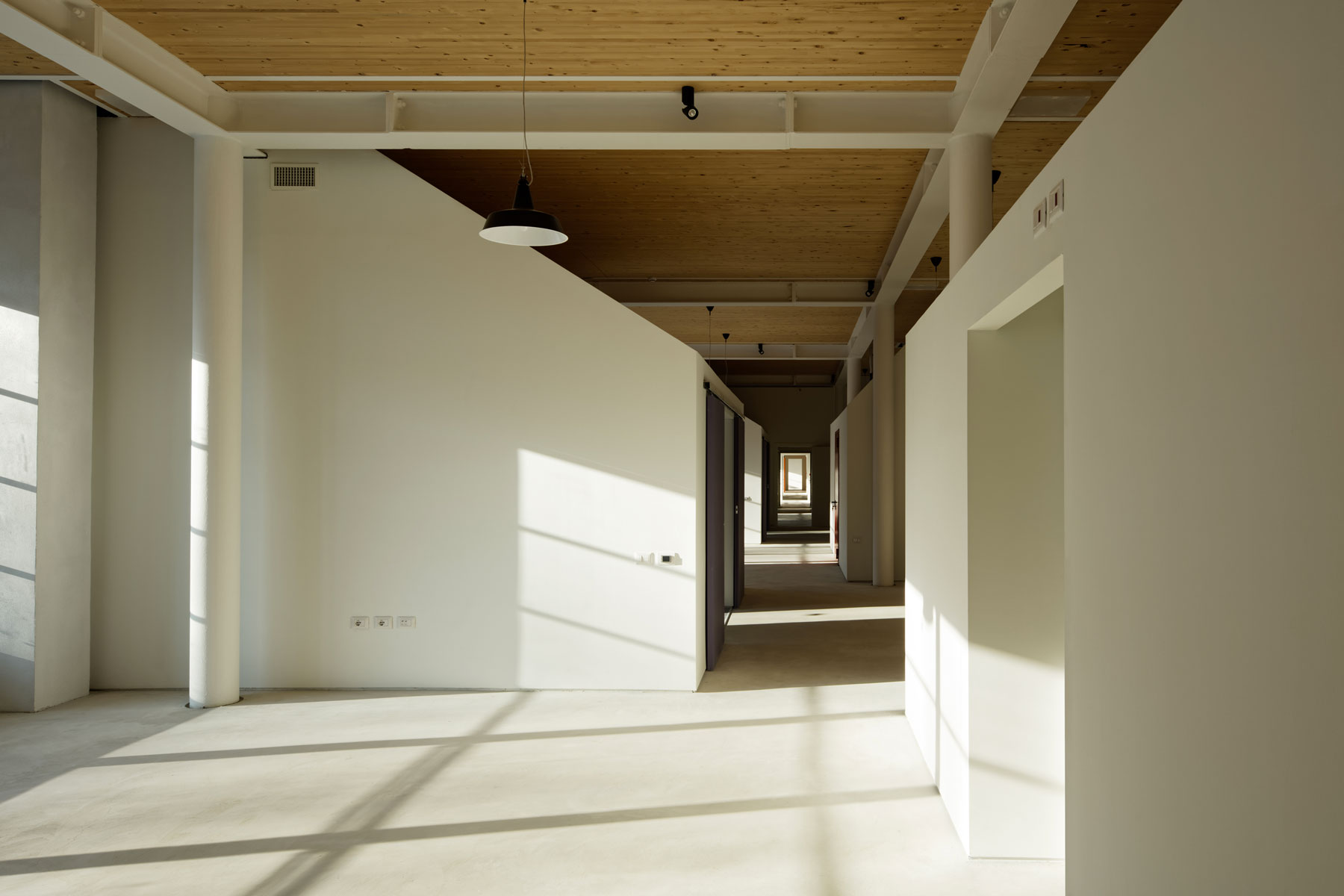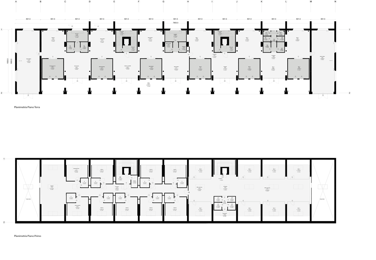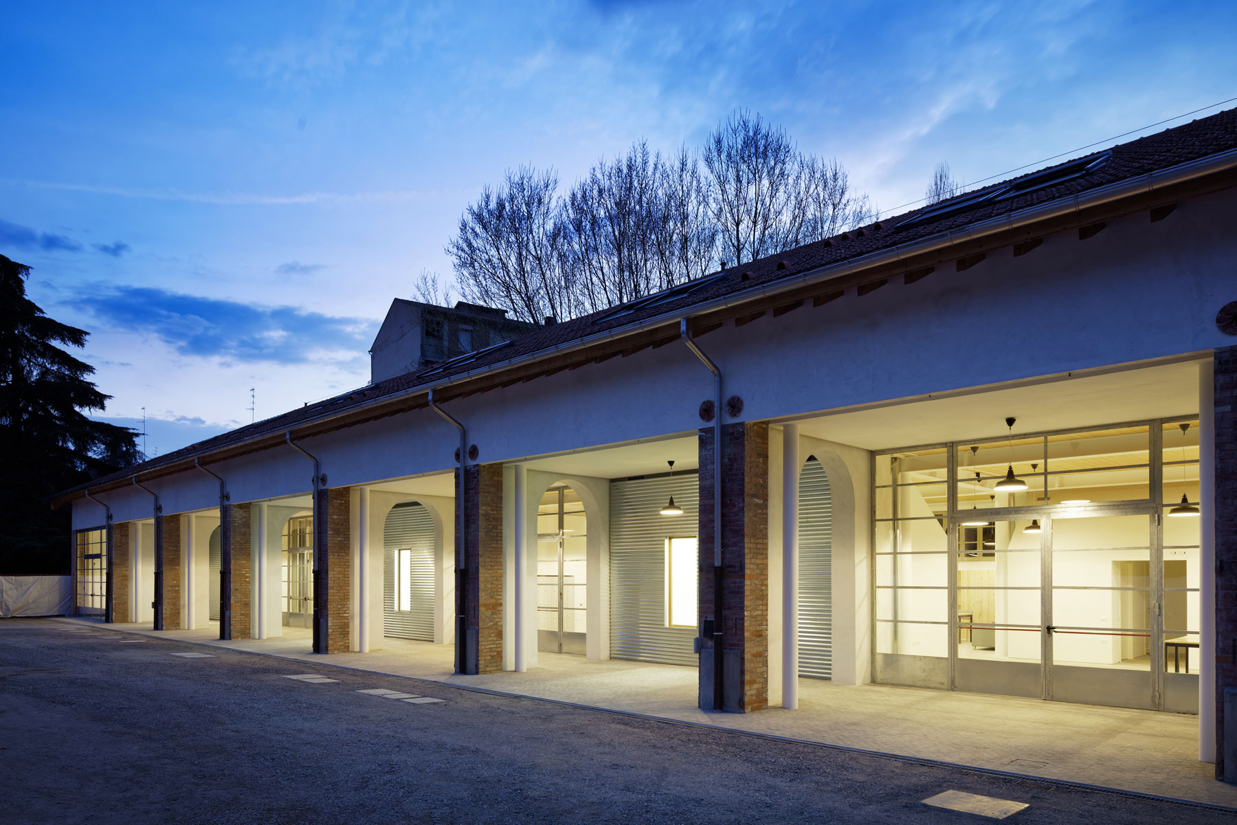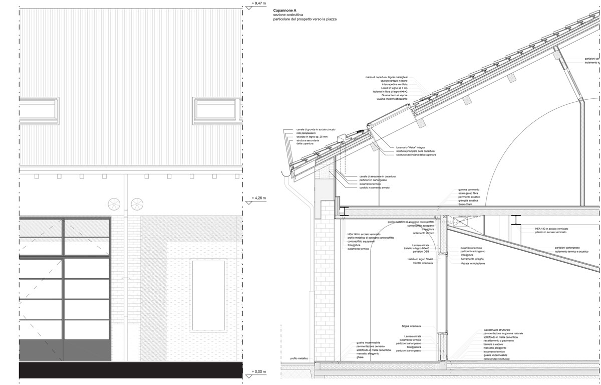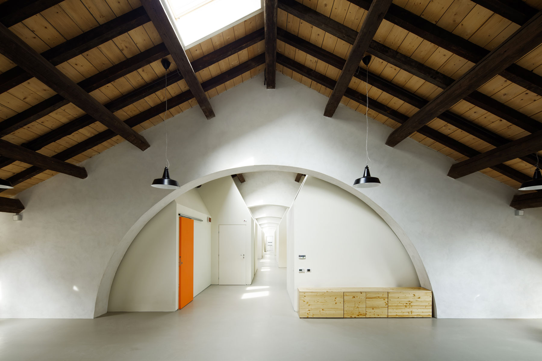 Ai due capannoni sostanzialmente simmetrici hanno corrisposto scelte progettuali estremamente diverse: si è voluto infatti mantenere in uno dei due edifici la memoria della tipologia e la possibilità di apprezzare il suggestivo spazio originario, mentre si è scelto di utilizzare in modo più denso l’altro edificio soppalcandolo quasi interamente e collocandovi le funzioni che richiedono una maggiore articolazione dello spazio (per ragioni funzionali e di privacy).
