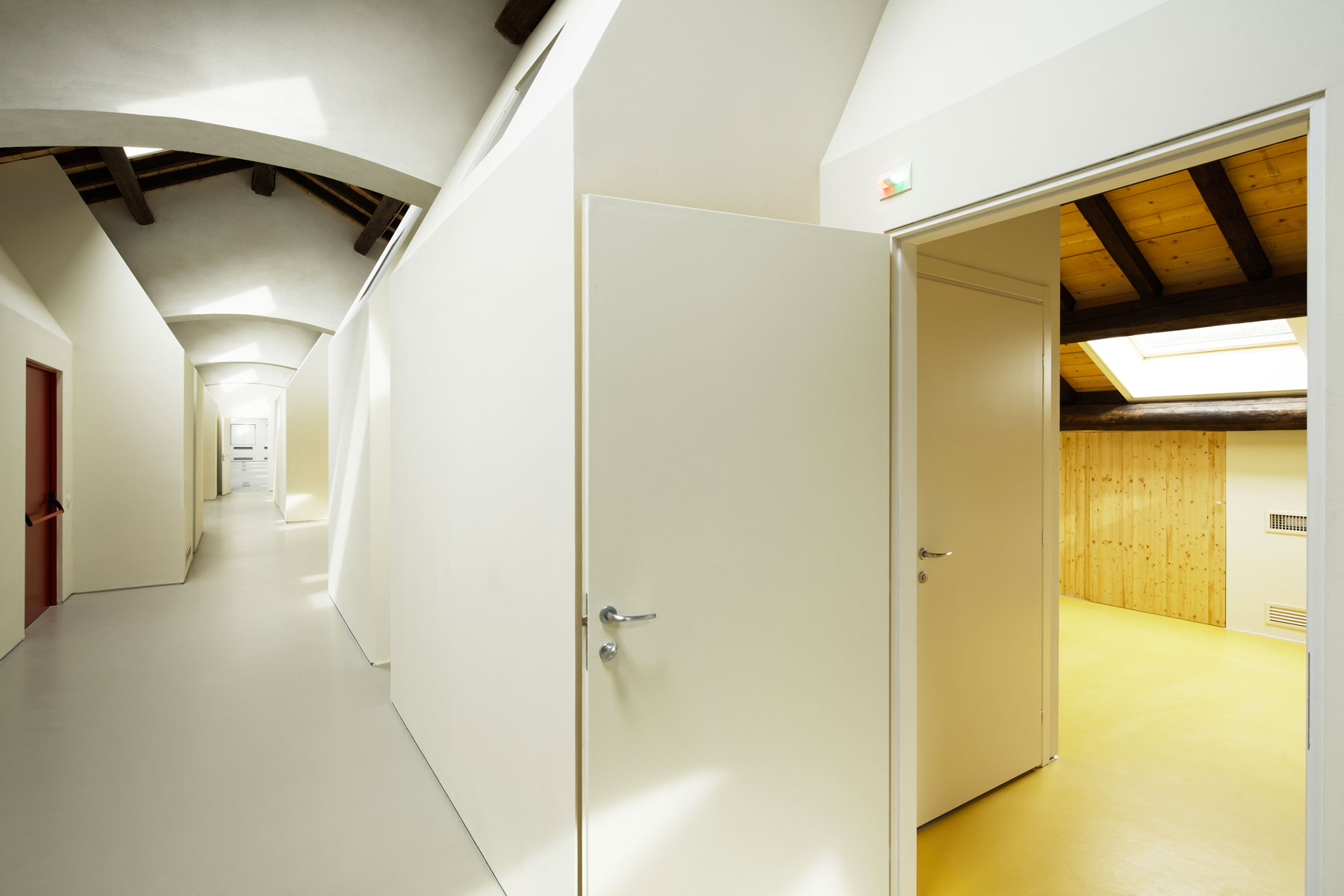 La totalità degli elementi architettonici inseriti all’interno degli edifici ha previsto il ricorso a sistemi costruttivi a secco, che garantisce una completa reversibilità degli interventi, sia per le nuove strutture (pilastri in acciaio slegati dalle murature esistenti e solai prefabbricati in legno), che per le partizioni interne (pareti di cartongesso).